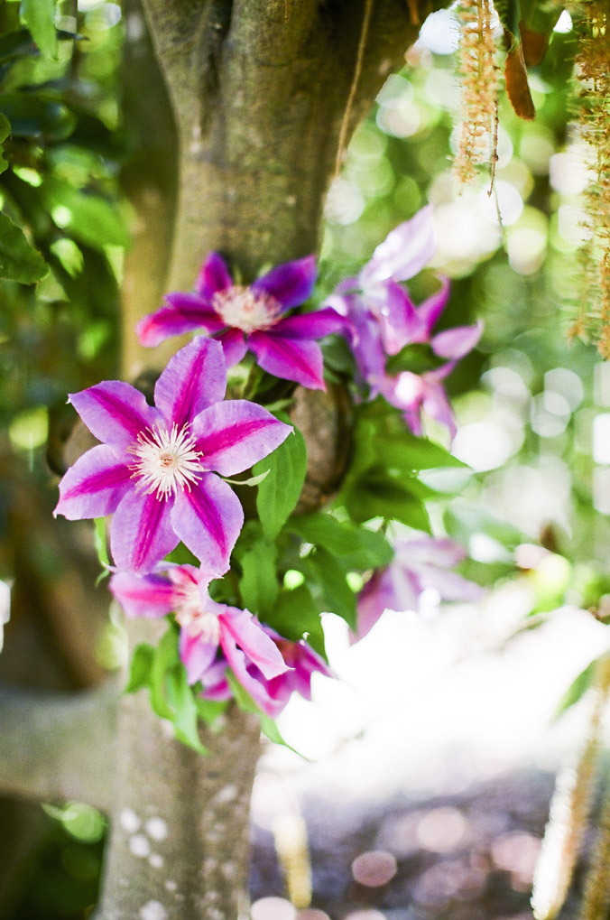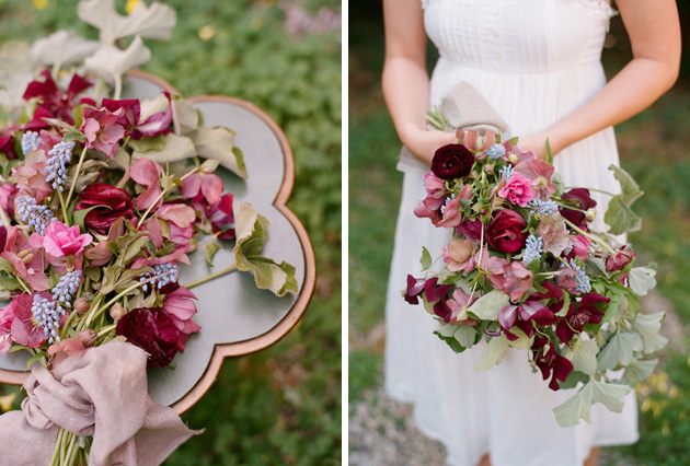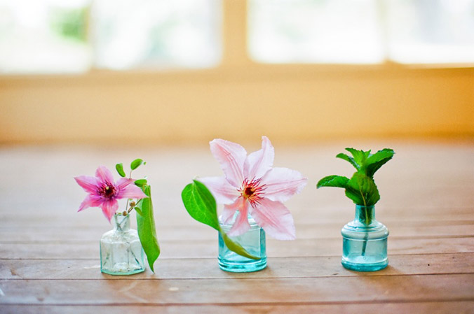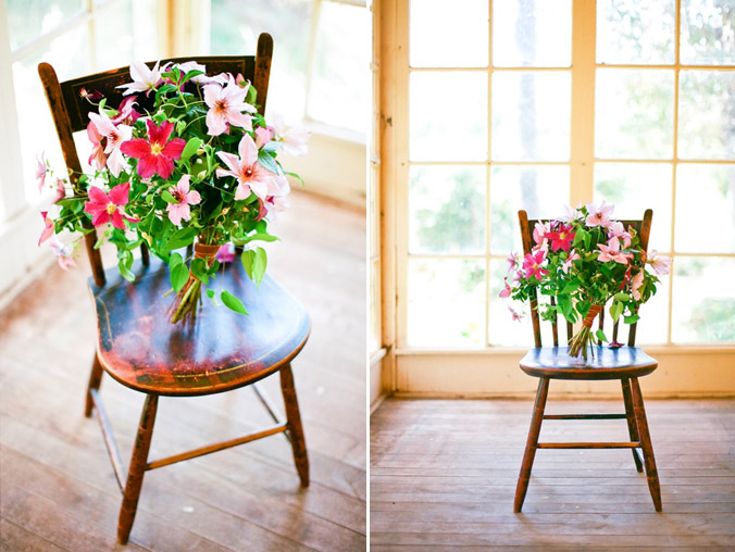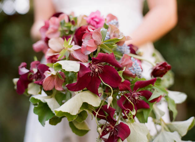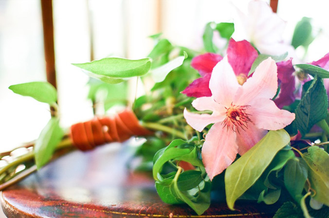 Dark pink and light clematis paired with mint makes a simple (and fragant) garden bouquet perfect for a spring or summer wedding.