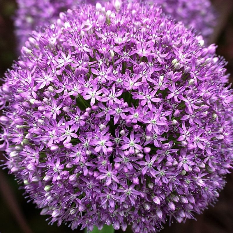 Ambassador allium, also known as the ornamental onion, is a bloom head that is globe-shaped that is composed of many tiny purple flowers.