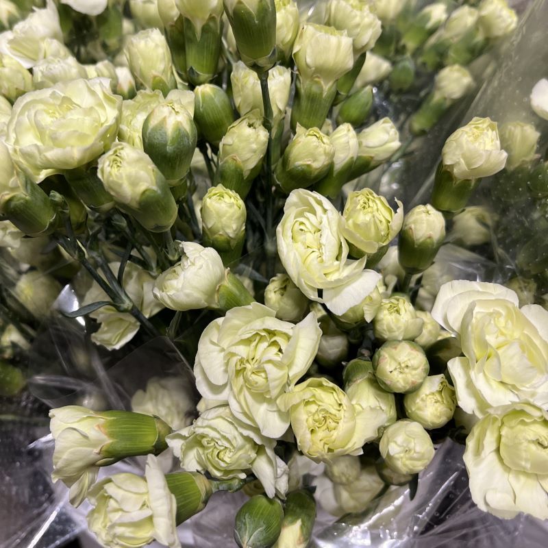 Mini green carnations have multiple small blooms on a stem. Bud count is 4-5 and stem length 12-18″. There are 10 stems in a bunch.
