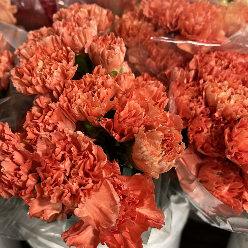 Standard carnations have many new exciting novelty varieties and are now available year-round. They have no fragrance and are natural in color. Standard colors are red, white and pink. All other colors (yellow, orange, peach, green, purples, earth tones and bi-colors are considered “novelties”). Look for new novelties in earth tones, peach tones, burgundy, green, and bi-color purples, pinks, oranges, and yellows. They have an excellent vase life. These orange carnations are packed with 25 stems per bunch.