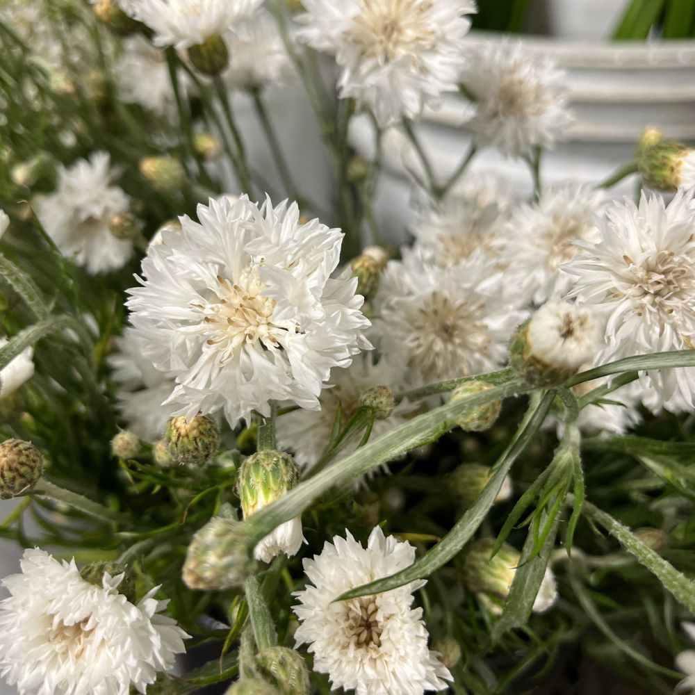 White centaurea, commonly known as cornflower, comes in a grower’s bunch of 7-10 stems depending on time of the year. Stems are somewhat delicate. Length is about 20-25″ and they add a great color and texture to any bouquet.
