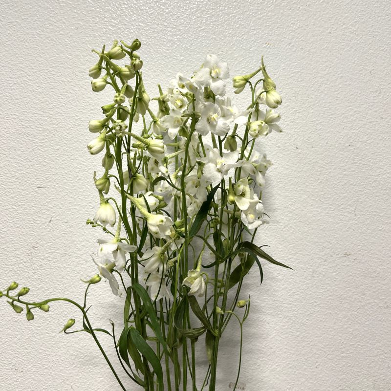 Our California grown local white delphinium is available year-round. Each stem has white bell-shaped flowers on tall stems. Grower’s bunch contains 7-10 stems.