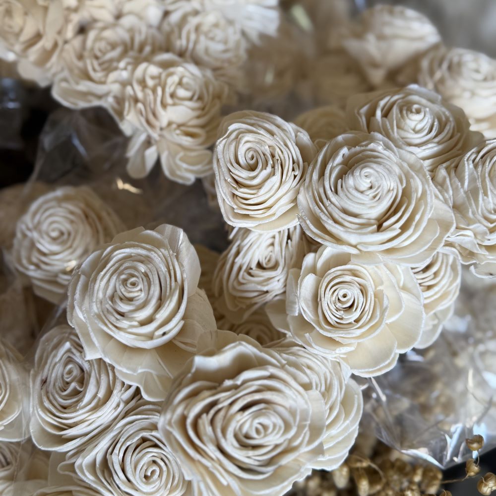 Dried Sola Beauty Roses are around 12″ tall and are sold in bunches of 10.