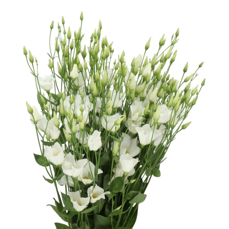 White Botanic lisianthus has single-petaled, airy flowers. They are bunched 5-7 stems depending on the size of the stems and grower. Lisianthus is generally 18-24″ in stem length.