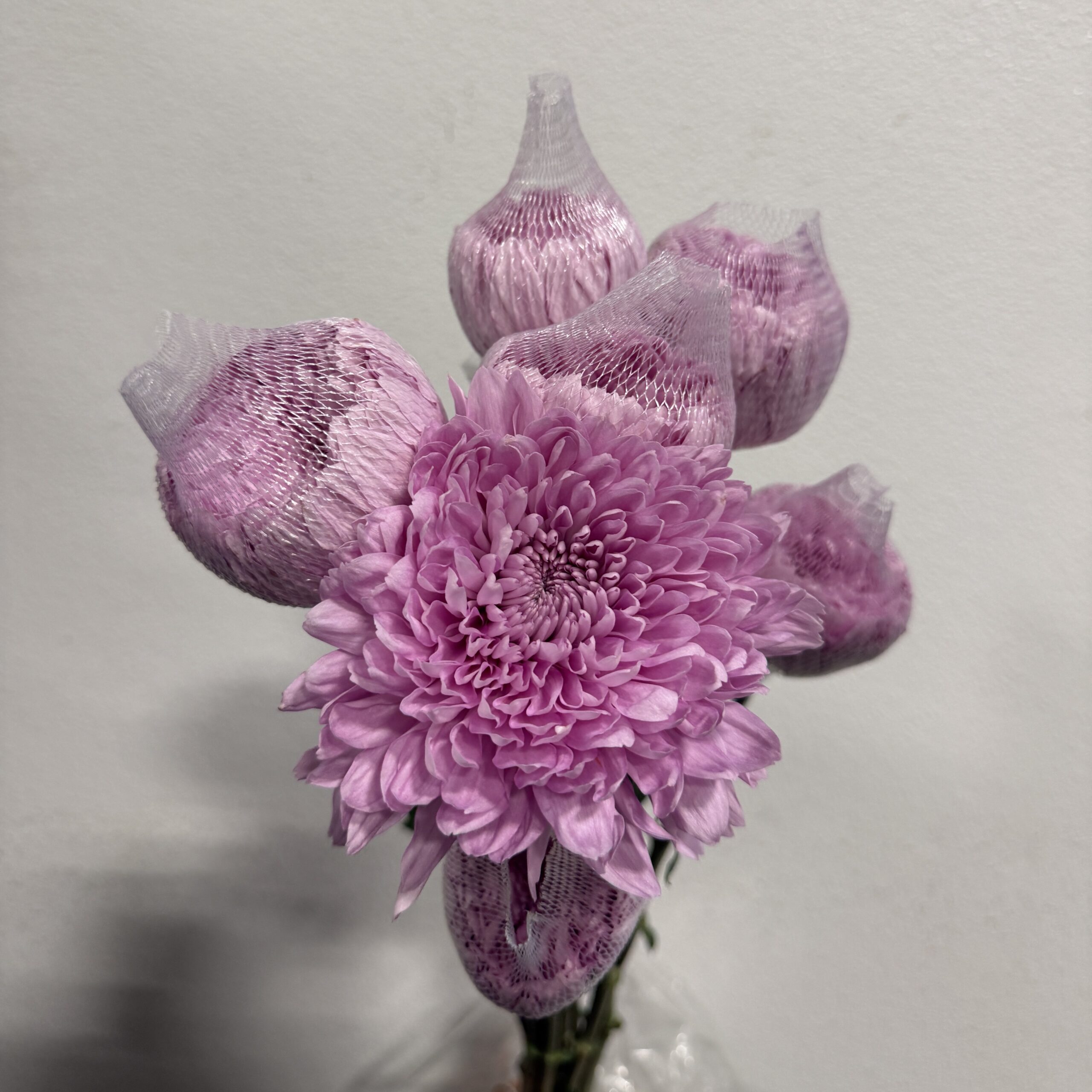 Chrysanthemums, commonly called mums, are long lasting. The most popular types of chrysanthemums are: button, daisy, cushion, spider, micro spray, and santinis have multiple blooms on a stem. Disbuds are single large blooms, and spray mums have multiple smaller blooms per stem. Lavender cremone mums have 10 stems per bunch. Available year-round.