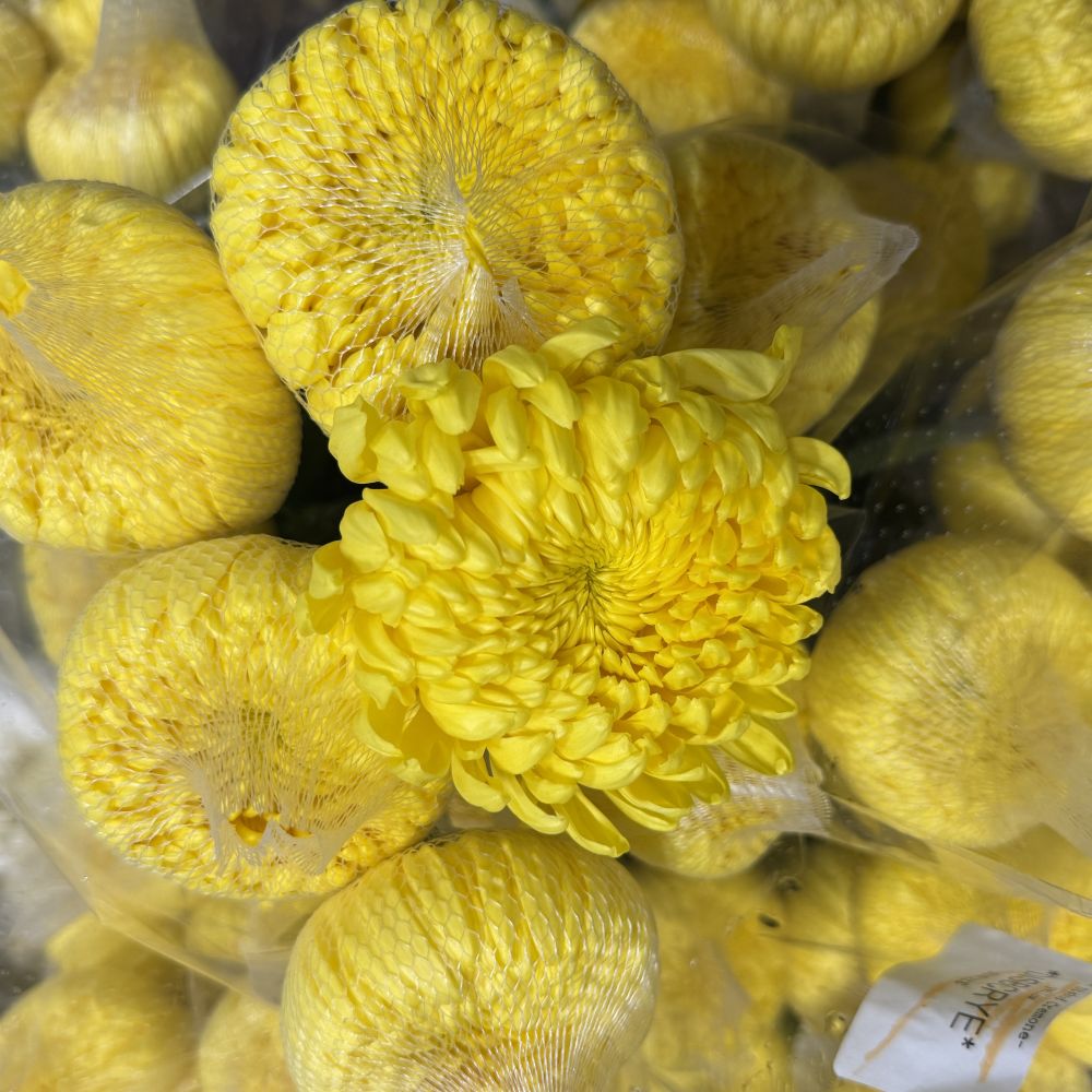 Chrysanthemums, commonly called mums, are long lasting. The most popular types of chrysanthemums are: button, daisy, cushion, spider, micro spray, and santinis have multiple blooms on a stem. Disbuds are single large blooms, and spray mums have multiple smaller blooms per stem. Yellow cremone mums have 10 stems per bunch. Available year-round.