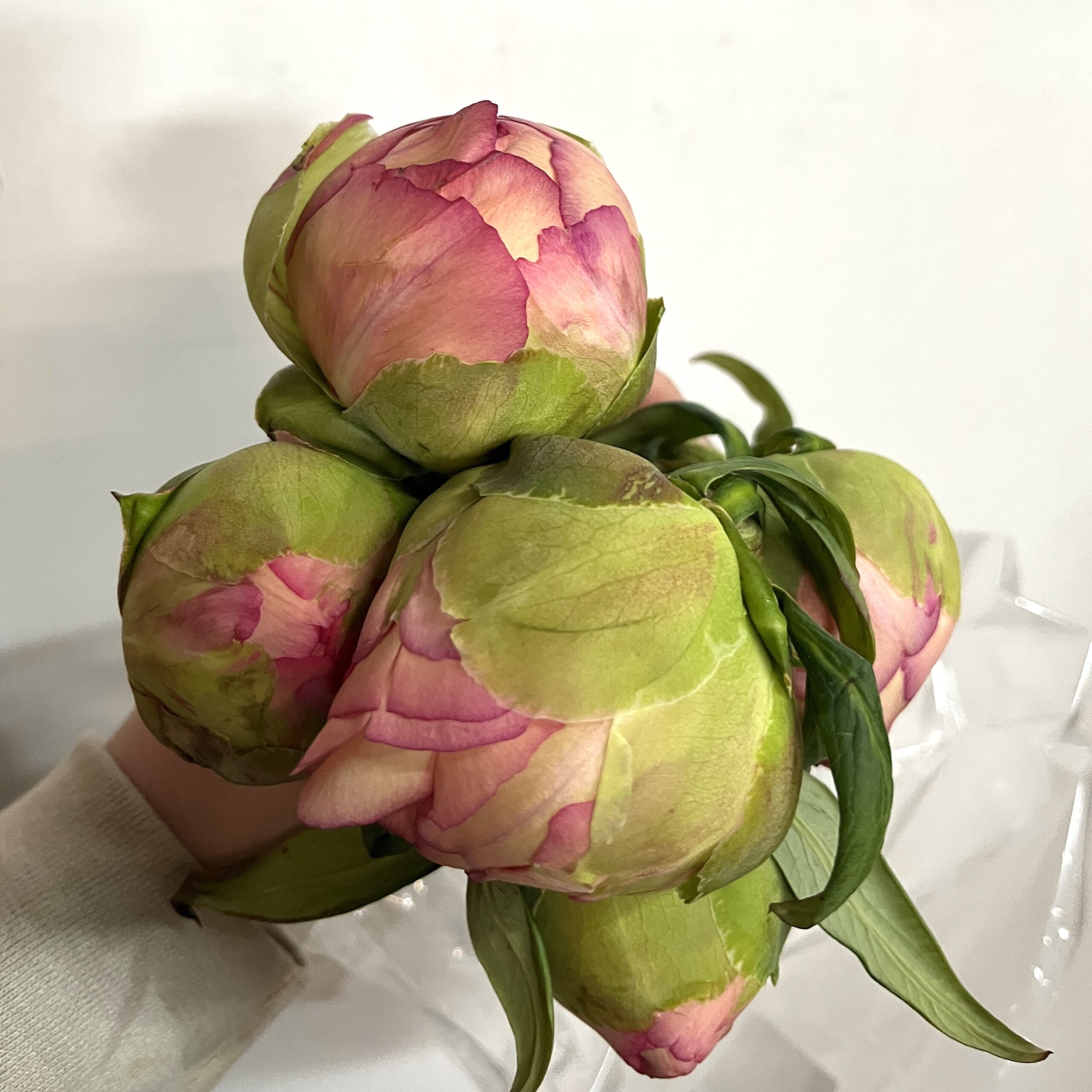 Tree Peonies are grown in Chile and are sold with 5 stems per bunch. Stem length is short – about 8″.