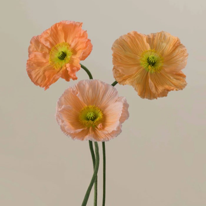 Imported poppies are a stunning addition to any design. Though dainty, these pack a big punch. We recommend ordering extra, just in case any get damaged in transit. Color can range from a pale peach to a bolder, almost orange color. 10 stems per bunch.