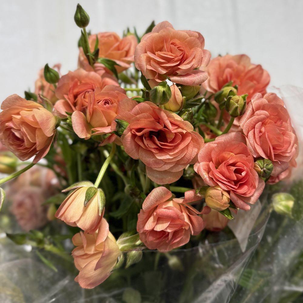 Butterfly ranunculus are fairly new. The flowers, like this beautiful peach variety, have a little bit of a butterfly shape and are considered delicate. They are an excellent cut flower and are long lasting in vase arrangements and bouquets. Butterfly ranunculus are a cool climate crop. Grown in California, the growing and harvest season is from mid January until May/June. Butterfly ranunculus have a stem length of about 20-25″ with many flowers on a single stem. The bunch grade is 10 stems and they do not have fragrance. We suggest placing your order at least 7 business days in advance.
