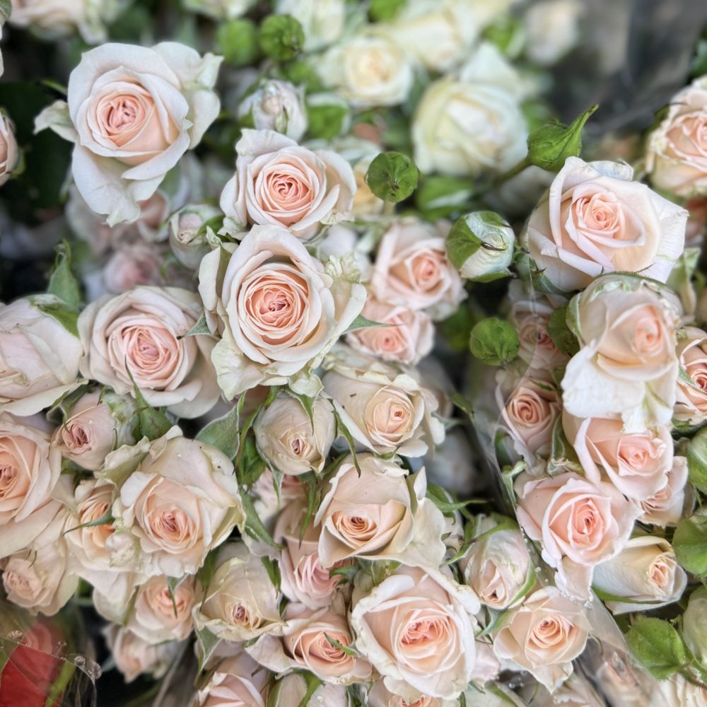 These California grown Sweet Sara spray roses are a sweet peachy light pink. Spray roses have multiple small blooms on each stem. 8-10 stems per bunch. These are grown locally here in California, so they are fresher when we get them. Please order one to two weeks in advance during the busy wedding season, as these sell fast! Available year-round.