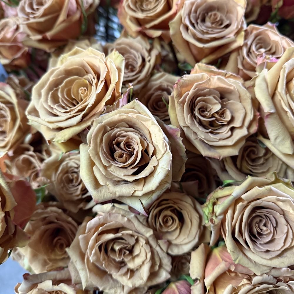 Beige/brown Toffee roses are truly stunning with their unique twirl pattern. 25 stems per bunch. Limited supply, please order in advance. Contact your Wholesale Floral Consultant for availability if this is listed as out of stock.