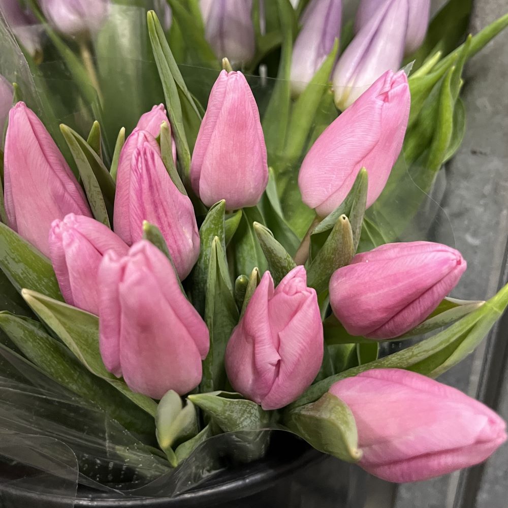 Pink tulips are great to use in a vase or a bouquet and are often combined with other spring flowers. Tulips are available year-round, however the best time is October through June. Exact shade of pink may slightly vary. 10 stems per bunch.