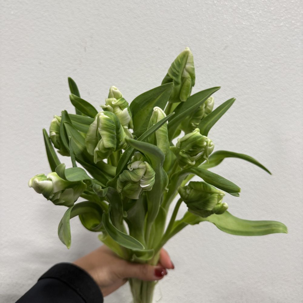 White Parrot tulips are available year-round, but peak season is January through May. The Parrot tulips have scalloped petals which are unlike any other flower out there. Great to use in spring arrangements. 10 stems per bunch. Please order at least a week in advance.