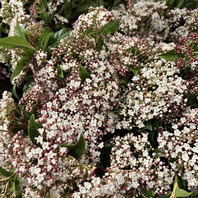 The flowering Tinus viburnum has a taller stem length. Tinus Viburnum adorned with a pinky-white bud that open to small white blooms. Available in the Summer, and sold in a grower’s bunch.