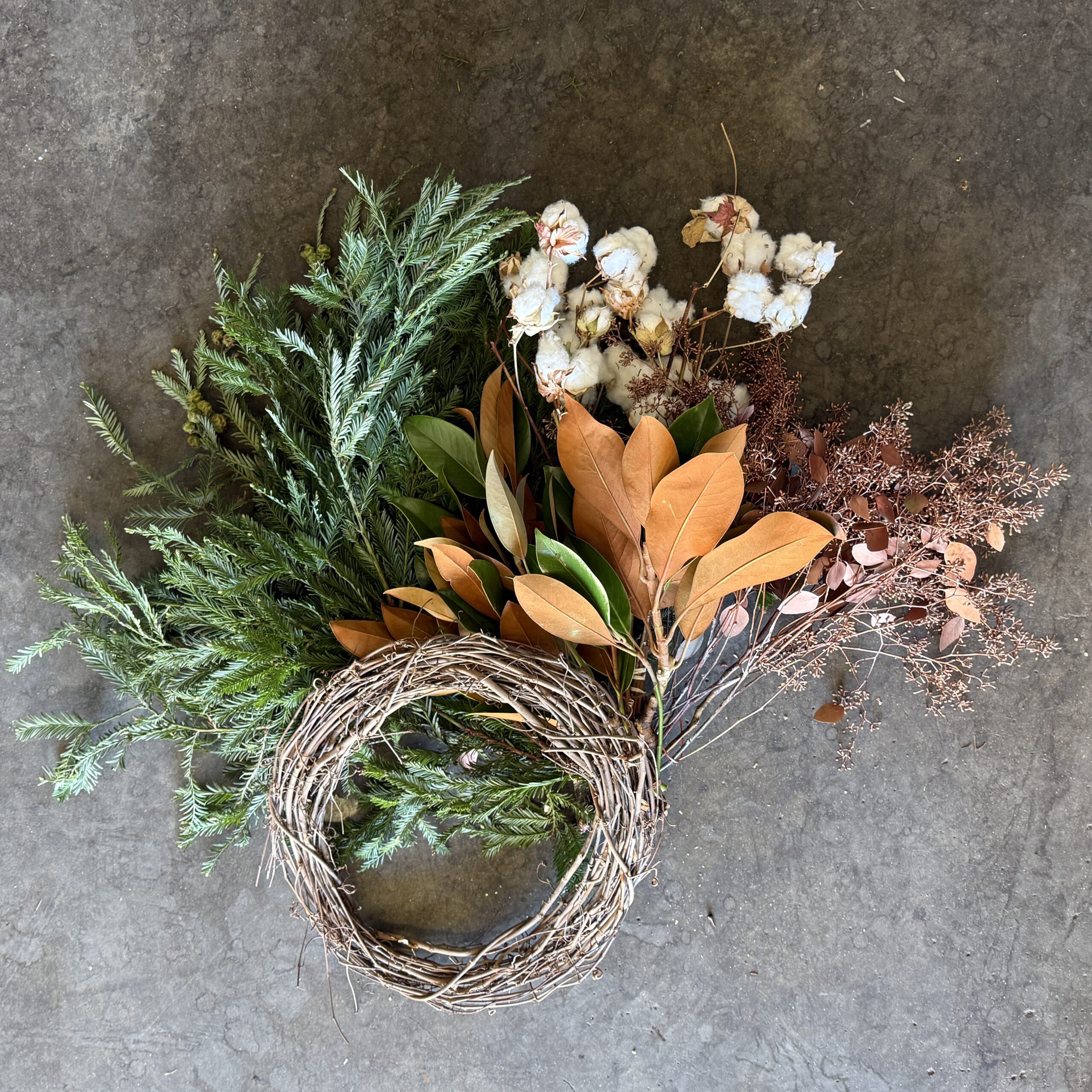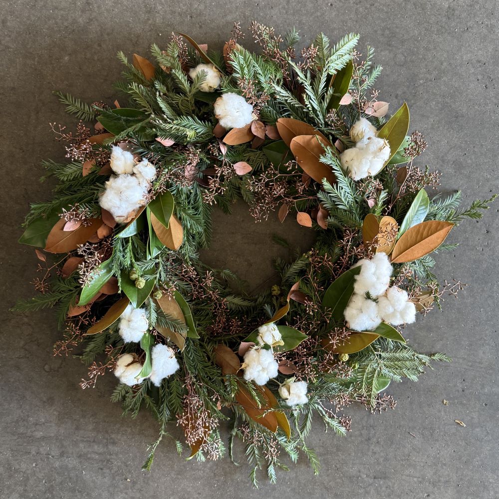 Ingredients include: Grapevine Wreath, Redwood Foliage with Cones, Magnolia Tips, Dried Cotton Branches, and Gold Seeded Eucalyptus.